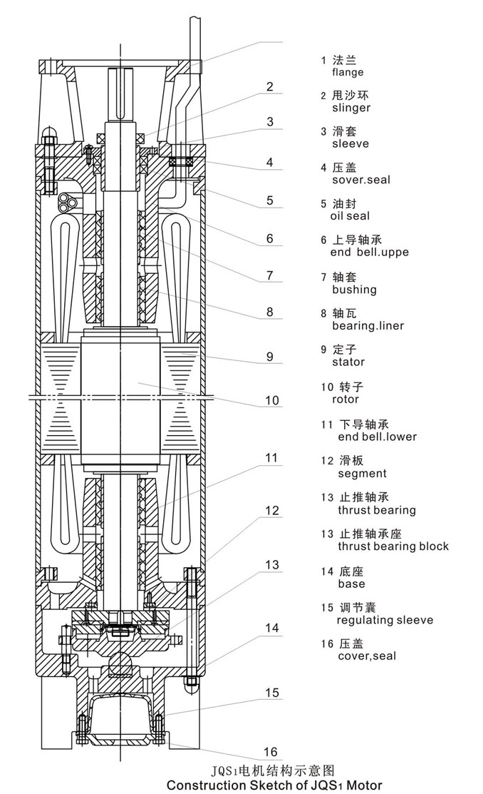 1. 潛水電機(jī)由定子、轉(zhuǎn)子、上下導(dǎo)軸承、下連接法蘭、底座、軸伸密封裝置等組成。