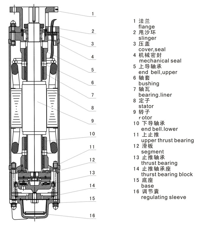 注:高推力型軸承需特殊訂貨,采用高推力型軸承的電機(jī)性能由用戶與制造廠協(xié)議。適用條件 1、電動(dòng)機(jī)應(yīng)完全潛入水中立式(或臥式適用),其潛入深度不大于70m,但不小于20m,最底位置距井底不少于5m(臥式使用時(shí)水位應(yīng)高于潛水電機(jī)1m以上)。 2、介質(zhì)水溫不高于20℃。 3、水中固體雜質(zhì)含量(重量比)不超過0.01%。 4、水中氯離子含量不得超過400mg/L; 5、水中硫化氫含量不得大于1.5mg/L; 6、介質(zhì)水中不含腐蝕性物質(zhì),PH值在6.5-8.5范圍內(nèi)。 7、電機(jī)運(yùn)行時(shí)內(nèi)部應(yīng)充滿潔凈的清水(可加防凍液)。 設(shè)備特點(diǎn) ★ 電機(jī)防護(hù)等級(jí):IPX8,絕緣等級(jí)為F; ★ 充水式潛水電動(dòng)機(jī)結(jié)構(gòu)簡單,定轉(zhuǎn)子繞組和鐵心直接浸在水中,冷卻效果好、輸出功率大、效率較高。 ★ 由于充水式潛水電動(dòng)機(jī)內(nèi)腔所充多為清水,使用過程中產(chǎn)生的滲漏對所安裝使用井水水質(zhì)不會(huì)產(chǎn)生污染。 ★ 充水式潛水電動(dòng)機(jī)的定子繞組。鐵心很軸承均在水中工作,對定子繞組所使用上網(wǎng)導(dǎo)線及其加工工藝、接頭材料及包扎工藝、水潤滑軸承的結(jié)構(gòu)、材料及加工工藝、鐵心與金屬材料的防銹防腐蝕處理等有很高的要求。 電動(dòng)機(jī)結(jié)構(gòu) 1、 潛水電機(jī)由定子、轉(zhuǎn)子、上下導(dǎo)軸承、下連接法蘭、底座、軸伸密封裝置等組成。 2、 潛水電機(jī)各止口連接處采用密封圈密封;軸伸密封根據(jù)水質(zhì)含砂量多少,選擇不同方式的密封裝置。(含砂量大于0.01%時(shí)采用橡膠骨架油封;含砂量大于0.01-0.5%時(shí)采用機(jī)械密封) 3、 電動(dòng)機(jī)下部裝有橡膠調(diào)節(jié)囊,其作用為當(dāng)電機(jī)內(nèi)部熱脹冷縮時(shí)及電機(jī)外部水位高低變化時(shí),用以平衡電機(jī)內(nèi)腔與水的壓力。 4、 電動(dòng)機(jī)定子繞組采用耐水絕緣線,有良好的絕緣能力,繞組線與耐水JHS型電纜連接。 5、 潛水電機(jī)上、下導(dǎo)軸承座內(nèi)裝有軸瓦,轉(zhuǎn)子下部裝有止推軸承。止推軸承由上、下止推軸承及滑板組成,用于承擔(dān)軸向力。